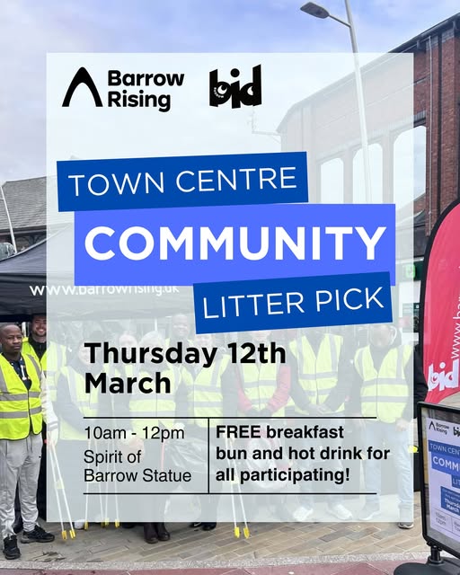 The next community litter pick with Barrow Bid and Barrow Rising takes place on Thursday 12th March - and everyone’s welcome to get involved.